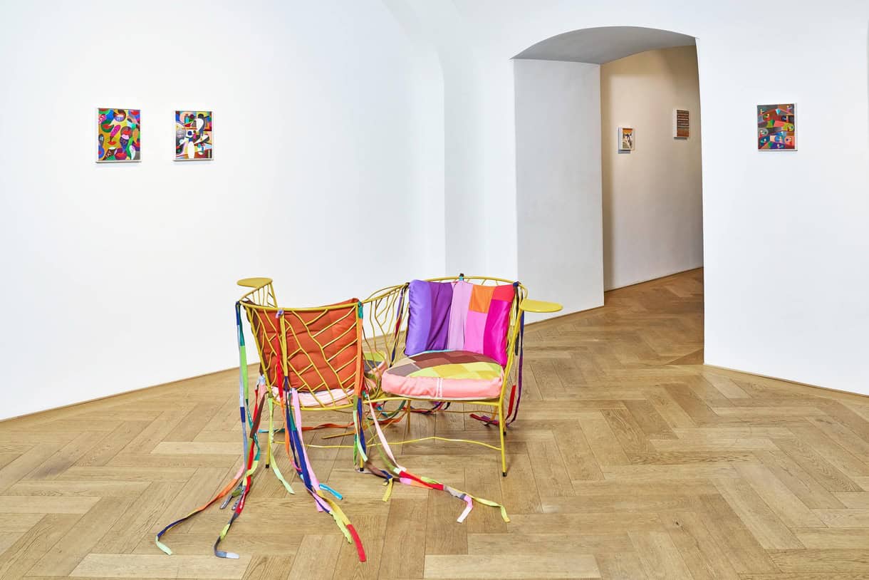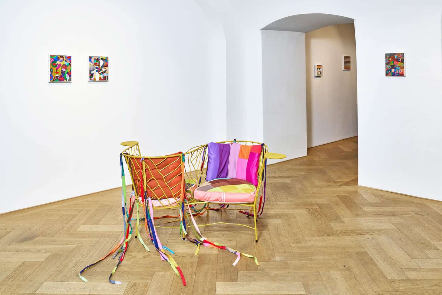 Die gleichzeitig gezeigten kleinformatigen gemalten Bilder übernehmen die Intensität des Farbmosaiks, wobei hier die Inhalte mit weiteren Elementen wie Gesicht, Augen und Mündern angereichert sind. Hat der Künstler schon in der Werkgruppe kisses & more zeigen können, dass aus genähten Lippen durch Haptik und das taktile Element des Textilen der Bildsprache neue Bedeutungen beigemessen werden können, so ergänzt er nun in einem weiteren Schritt seine Arbeit mit Textilobjekten.