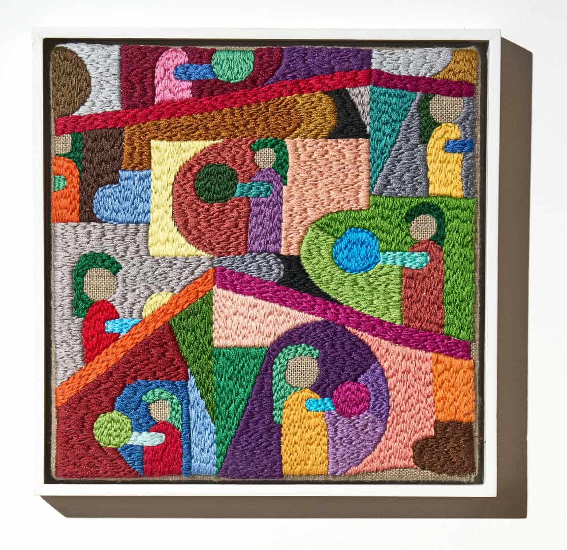 Auf und ab wandern die Figuren. Eine weibliche Gestalt fügt sich in eine Formenarchitektur von Räumen, die alle metaphysischen Botschaften in ineinandergreifende Farbelemente aufzulösen scheint. Durch die Stickereien wird die Bedeutung der Fragestellungen hervorgehoben, die Technik transformiert somit den Inhalt in einen spirituellen Bereich.