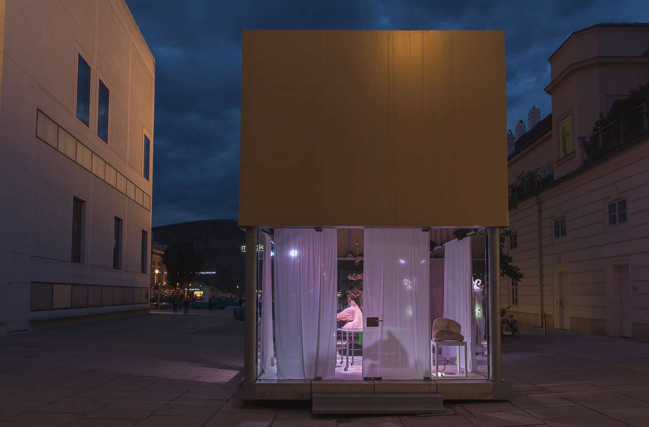 Die Installation bezieht sich auf die Geschichte des Museumsquartiers, welches ehedem als Hofstallung diente (geplant von Johann Bernhard Fischer von Erlach, Auftragserteilung durch Kaiser Karl VI. im Jahr 1713). Der sogenannte Spanische Stall war einer der grössten Marställe, in welchen – nach den berühmten Eipeldauer Briefen Joseph Richters vom Ende des 18.Jahrhunderts – die Pferde „schöner logierten als der Kaiser selbst“. Heute „wohnt“ die Kunst im Stall. Die Installation von Elisabeth von Samsonow ist eine Hommage an das Pferd. Das Pferd als Phantom des Museums und cadavre exquis – das Skelett des Lieblingspferds der Kaiserin Elisabeth – wird umtanzt von Pferde-Skulpturen von Elisabeth von Samsonow. Ein gelooptes Video auf der Stirnseite der Art Box thematisiert die rätselhaft romantische Pferd-Mädchenbeziehung.
