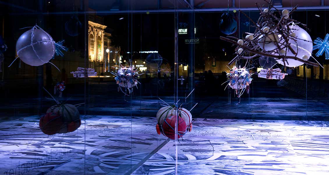 Auch in der gleichnamigen Installation von Alois Mosbacher verlassen die schwebenden Objekte den artifiziellen Garten, in dem sie sich befinden, nicht. Die mit Kohle und Kreide gezeichneten Äste, Blätter und Früchte verwandeln sich, steigen auf und erstarren in einer dreidimensionalen Form. Mosbacher betreibt Science Fiction, doch erschafft er keine dystopische Zukunft. Science Fiction bringt uns zum Träumen: von einer möglichen Zukunft mit der Vision, die Welt zu verbessern.