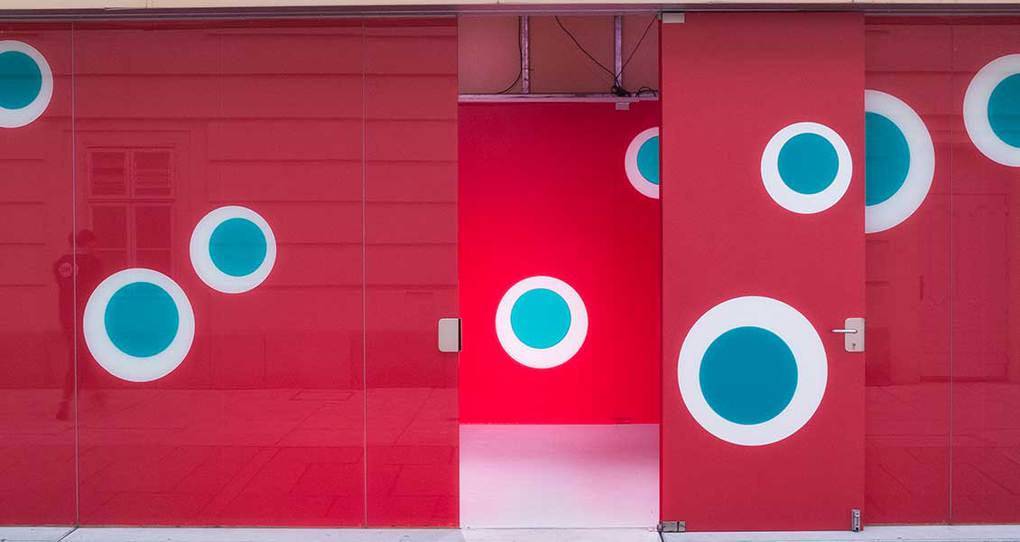 In einer Zeit, in der es im urbanen Raum kaum mehr einen Ort des Verweilens gibt, der nicht von Werbeplakaten und Monitoren zugepflastert ist und jede Tankstelle am Abend aussieht wie eine epigonale Lichtinstallation von Dan Flavin, wird der ästhetische Kampf um Aufmerksamkeit im öffentlichen Raum schwerer. Uta Weber wählt den umgekehrten Weg der Interaktion: sie zitiert Formen des Produktdesigns und adaptiert das Vokabular der Reklame, um Erlebnisräume zu schaffen, die frei von Botschaften und Werten sind. In ihrer Installation «Blow – Flow – Glow» hat sie eine transluzente Folie auf die MQ ARTBOX affichiert, deren kreisrunde Formen im wahrsten Sinne zu wehen, fließen und glühen scheinen. Die blickdichte Verhüllung des Raumkörpers weckt Neugierde für den gläsernen „Kunstquader“ und elektrisches Licht verwandelt die Architektur zur farbig leuchtenden Licht-Skulptur. Es ist die im Titel anklingende Leichtigkeit die die Arbeiten von Uta Weber kennzeichnet: Einfachheit der Form, Klarheit der Farben, Präzision des Konzepts, Ironie der Anspielungen und Gelassenheit im Umgang mit kunsttheoretischen Diskursen.