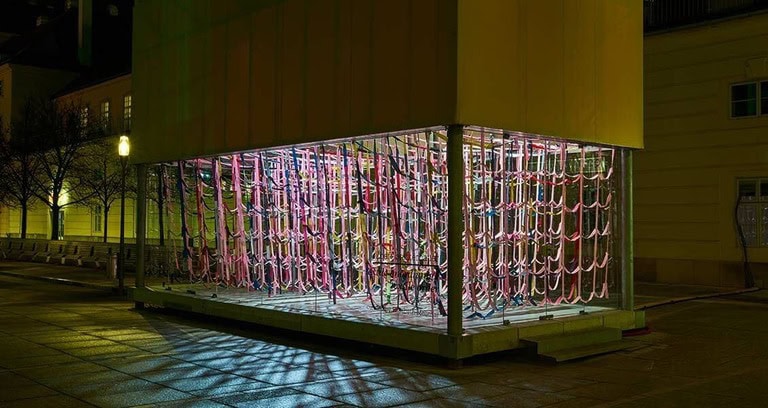 in regelmäßigen abständen sind netze derart aneinandergereiht, dass sie den raum als undurchdringbar erscheinen lassen, und ermöglichen gleichzeitig doch, abhängig von der betrachtungsposition, durchblicke. durch die, in einer geometrischen anordnung gereihten textilen ebenen, wird das leere volumen, in dem farbgruppen muster bilden, erst sichtbar. die perspektive der wahrnehmung erzeugt die dreidimensionalität des raumes, textile bänder verleihen ihm durch ihren hängenden charakter eine haptische komponente.