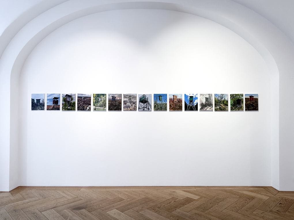 One day they caught my eye. These small wooden buildings on stilts in the Weinviertel landscape. And how many there were. In the vineyards, fields and forests, some already marked by the weather. Some are even prefabricated and on wheels. During the day they are usually empty, only in the early hours of the morning and in the evening sometimes someone is sitting inside. It is a strange feeling to be watched by someone while walking. Looking at the landscape becomes a theme. While painting the small oil paintings, Robert Zimmerman kept coming up again and again