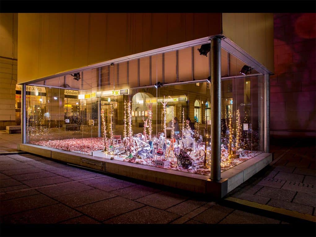 Zur Adventszeit hat Daniel Spoerri eigens für die Art Box zwei Installationen miteinander verbunden: einige Tannenbaum-Skelette und das 2010–2015 entstandene Werk alpha & omega. Die griechischen Anfangs- und Endbuchstaben des Alphabets stehen für Anfang und Ende des Lebens. Kinder- und Puppenstubenstühlchen dienen als Sockel für Schädel. Die Objekte stammen aus unterschiedlichen Kulturen: ein Aborigine-Schädel aus Neuguinea mit Nasenknochenschmuck wurde auf ein Schulstühlchen aus der ehemaligen DDR montiert. Ein Keltenschädel aus den Grabungsfunden in Hallein (ein Geschenk des verstorbenen Künstlerfreundes Alfons Schilling) „sitzt“ auf einem himmelblauen Kinderküchenschemel. Nadellose Christbäume hat Daniel Spoerri bereits 1981 einmal in der Berliner Ausstellung „Musée sentimental de Prusse“ zum Stichwort „Weihnachten“ gezeigt